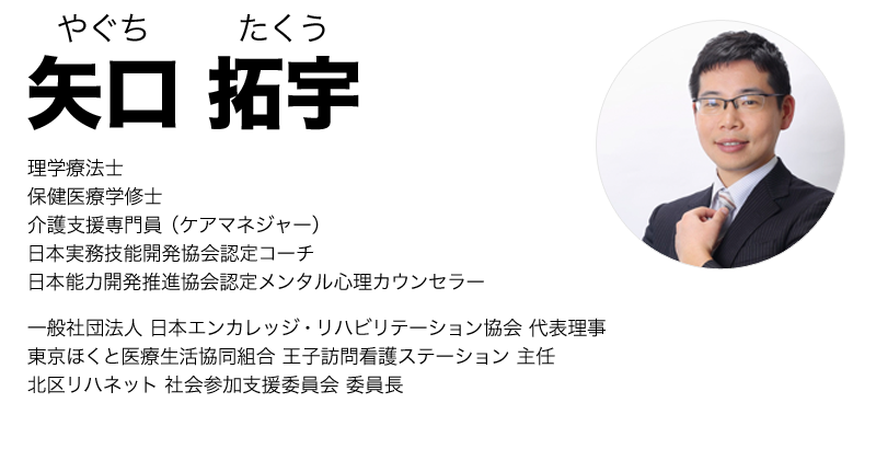 脳卒中等で障害を抱えた方の当事者グループ「リハビリなかまの会」を立ち上げ、仲間づくりの場として交流会や旅行を企画。ピアサポート(同じ課題を持つ人たちの相互支援)により障害を受け入れることができることを実感。そして、リハビリに前向きになれない方をサポートする学びの場として「一般社団法人日本エンカレッジ・リハビリテーション協会を設立し、リハビリ、医療、介護従事者のコミュニケーション技能向上をサポートすることを決意する。